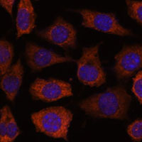 Immunofluorescent analysis of GRHPR staining in L929 cells. Formalin-fixed cells were permeabilized with 0.1% Triton X-100 in TBS for 5-10 minutes and blocked with 3% BSA-PBS for 30 minutes at room temperature. Cells were probed with the primary antibody in 3% BSA-PBS and incubated overnight at 4 °C in a humidified chamber. Cells were washed with PBST and incubated with a AF594-conjugated secondary antibody (red) in PBS at room temperature in the dark. DAPI was used to stain the cell nuclei (blue).