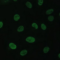Immunofluorescent analysis of TFIIE-alpha staining in U2OS cells. Formalin-fixed cells were permeabilized with 0.1% Triton X-100 in TBS for 5-10 minutes and blocked with 3% BSA-PBS for 30 minutes at room temperature. Cells were probed with the primary antibody in 3% BSA-PBS and incubated overnight at 4 °C in a hidified chamber. Cells were washed with PBST and incubated with a Alexa Fluor 488-conjugated secondary antibody (green) in PBS at room temperature in the dark.