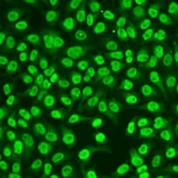 • Immunofluorescent analysis of hnRNP D staining in U2OS cells. Formalin-fixed cells were permeabilized with 0.1% Triton X-100 in TBS for 5-10 minutes and blocked with 3% BSA-PBS for 30 minutes at room temperature. Cells were probed with the primary antibody in 3% BSA-PBS and incubated overnight at 4 °C in a hidified chamber. Cells were washed with PBST and incubated with a Alexa Fluor 488-conjugated secondary antibody (green) in PBS at room temperature in the dark.