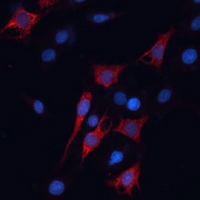 Immunofluorescent analysis of HSP70 staining in C6 cells. Formalin-fixed cells were permeabilized with 0.1% Triton X-100 in TBS for 5-10 minutes and blocked with 3% BSA-PBS for 30 minutes at room temperature. Cells were probed with the primary antibody in 3% BSA-PBS and incubated overnight at 4 °C in a hidified chamber. Cells were washed with PBST and incubated with a Alexa Fluor 594-conjugated secondary antibody (red) in PBS at room temperature in the dark.