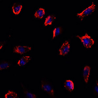 Immunofluorescent analysis of IL-11 staining in L929 cells. Formalin-fixed cells were permeabilized with 0.1% Triton X-100 in TBS for 5-10 minutes and blocked with 3% BSA-PBS for 30 minutes at room temperature. Cells were probed with the primary antibody in 3% BSA-PBS and incubated overnight at 4 °C in a humidified chamber. Cells were washed with PBST and incubated with a AF594-conjugated secondary antibody (red) in PBS at room temperature in the dark. DAPI was used to stain the cell nuclei (blue).