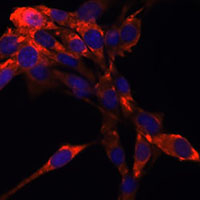 Immunofluorescent analysis of CD339 staining in NIH3T3 cells. Formalin-fixed cells were permeabilized with 0.1% Triton X-100 in TBS for 5-10 minutes and blocked with 3% BSA-PBS for 30 minutes at room temperature. Cells were probed with the primary antibody in 3% BSA-PBS and incubated overnight at 4 °C in a humidified chamber. Cells were washed with PBST and incubated with a AF594-conjugated secondary antibody (red) in PBS at room temperature in the dark. DAPI was used to stain the cell nuclei (blue).