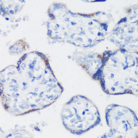 • Immunohistochemical analysis of Kisspeptin-1 staining in human placenta formalin fixed paraffin embedded tissue section. The section was pre-treated using heat mediated antigen retrieval with sodium citrate buffer (pH 6.0). The section was then incubated with the antibody at room temperature and detected using an HRP conjugated compact polymer system. DAB was used as the chromogen. The section was then counterstained with haematoxylin and mounted with DPX.