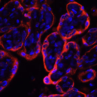 • Immunofluorescent analysis of Klotho staining in human placenta tissues. Formalin-fixed cells were permeabilized with 0.1% Triton X-100 in TBS for 5-10 minutes and blocked with 3% BSA-PBS for 30 minutes at room temperature. Cells were probed with the primary antibody in 3% BSA-PBS and incubated overnight at 4 °C in a hidified chamber. Cells were washed with PBST and incubated with a Alexa Fluor 594-conjugated secondary antibody (red) in PBS at room temperature in the dark.