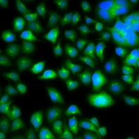 Immunofluorescent analysis of METTL7B staining in A549 cells. Formalin-fixed cells were permeabilized with 0.1% Triton X-100 in TBS for 5-10 minutes and blocked with 3% BSA-PBS for 30 minutes at room temperature. Cells were probed with the primary antibody in 3% BSA-PBS and incubated overnight at 4 °C in a hidified chamber. Cells were washed with PBST and incubated with a Alexa Fluor 488-conjugated secondary antibody (green) in PBS at room temperature in the dark.