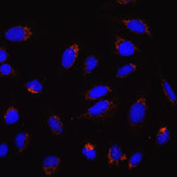Immunofluorescent analysis of MFN2 staining in U2OS cells. Formalin-fixed cells were permeabilized with 0.1% Triton X-100 in TBS for 5-10 minutes and blocked with 3% BSA-PBS for 30 minutes at room temperature. Cells were probed with the primary antibody in 3% BSA-PBS and incubated overnight at 4 °C in a humidified chamber. Cells were washed with PBST and incubated with a AF594-conjugated secondary antibody (red) in PBS at room temperature in the dark. DAPI was used to stain the cell nuclei (blue).