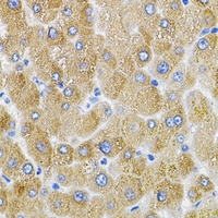 Immunohistochemical analysis of MFN2 staining in human liver formalin fixed paraffin embedded tissue section. The section was pre-treated using heat mediated antigen retrieval with sodium citrate buffer (pH 6.0). The section was then incubated with the antibody at room temperature and detected using an HRP conjugated compact polymer system. DAB was used as the chromogen. The section was then counterstained with haematoxylin and mounted with DPX. -