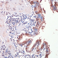 Immunohistochemical analysis of Musashi 1 staining in rat lung formalin fixed paraffin embedded tissue section. The section was pre-treated using heat mediated antigen retrieval with sodium citrate buffer (pH 6.0). The section was then incubated with the antibody at room temperature and detected using an HRP conjugated compact polymer system. DAB was used as the chromogen. The section was then counterstained with haematoxylin and mounted with DPX.