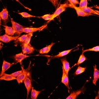 Immunofluorescent analysis of HGFL staining in C6 cells. Formalin-fixed cells were permeabilized with 0.1% Triton X-100 in TBS for 5-10 minutes and blocked with 3% BSA-PBS for 30 minutes at room temperature. Cells were probed with the primary antibody in 3% BSA-PBS and incubated overnight at 4 °C in a hidified chamber. Cells were washed with PBST and incubated with a Alexa Fluor 594-conjugated secondary antibody (red) in PBS at room temperature in the dark.
