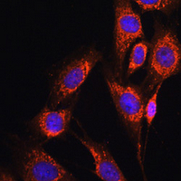 Immunofluorescent analysis of Nicastrin staining in NIH3T3 cells. Formalin-fixed cells were permeabilized with 0.1% Triton X-100 in TBS for 5-10 minutes and blocked with 3% BSA-PBS for 30 minutes at room temperature. Cells were probed with the primary antibody in 3% BSA-PBS and incubated overnight at 4 °C in a humidified chamber. Cells were washed with PBST and incubated with a AF594-conjugated secondary antibody (red) in PBS at room temperature in the dark. DAPI was used to stain the cell nuclei (blue).