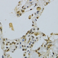 Immunohistochemical analysis of NLK staining in human lung formalin fixed paraffin embedded tissue section. The section was pre-treated using heat mediated antigen retrieval with sodium citrate buffer (pH 6.0). The section was then incubated with the antibody at room temperature and detected using an HRP conjugated compact polymer system. DAB was used as the chromogen. The section was then counterstained with haematoxylin and mounted with DPX.
