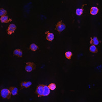 Immunofluorescent analysis of P2X5 staining in Jurkat cells. Formalin-fixed cells were permeabilized with 0.1% Triton X-100 in TBS for 5-10 minutes and blocked with 3% BSA-PBS for 30 minutes at room temperature. Cells were probed with the primary antibody in 3% BSA-PBS and incubated overnight at 4 °C in a humidified chamber. Cells were washed with PBST and incubated with a AF594-conjugated secondary antibody (red) in PBS at room temperature in the dark. DAPI was used to stain the cell nuclei (blue).