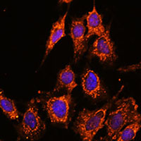 Immunofluorescent analysis of PASK staining in C6 cells. Formalin-fixed cells were permeabilized with 0.1% Triton X-100 in TBS for 5-10 minutes and blocked with 3% BSA-PBS for 30 minutes at room temperature. Cells were probed with the primary antibody in 3% BSA-PBS and incubated overnight at 4 °C in a humidified chamber. Cells were washed with PBST and incubated with a AF594-conjugated secondary antibody (red) in PBS at room temperature in the dark. DAPI was used to stain the cell nuclei (blue).