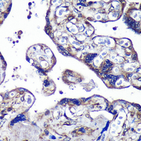 Immunohistochemical analysis of PASK staining in human placenta formalin fixed paraffin embedded tissue section. The section was pre-treated using heat mediated antigen retrieval with sodium citrate buffer (pH 6.0). The section was then incubated with the antibody at room temperature and detected using an HRP conjugated compact polymer system. DAB was used as the chromogen. The section was then counterstained with haematoxylin and mounted with DPX. -